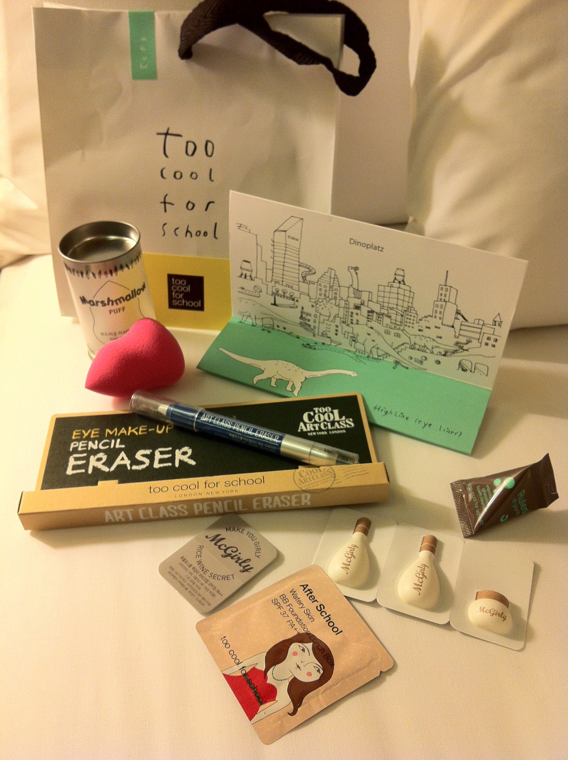 I got a sponge applicator, a sparkly smudge-free metallic brown eyeliner, and an interesting product called the Art Class Pencil Eraser. (The rest are samples; I like how all the stores give away plenty of samples so I get to try more of their products.)