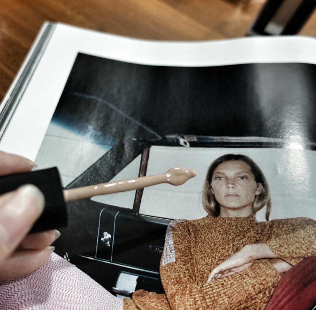 I glide the “quill” on the back of my hand, so a small puddle of foundation collects there. Using my hand as a palette, I smoothe on the foundation with my finger tips.