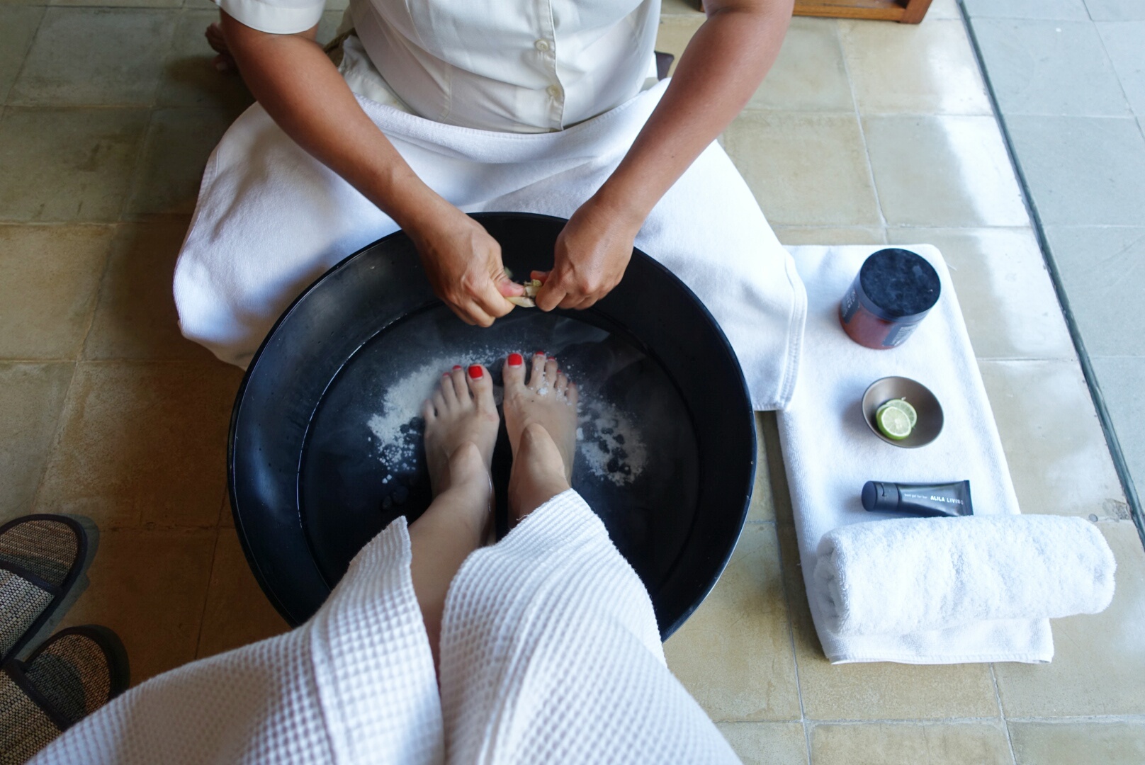 Salt, lemongrass and lime were added into a basin of warm water and volcanic rocks to purify my feet.